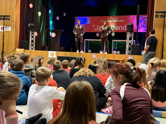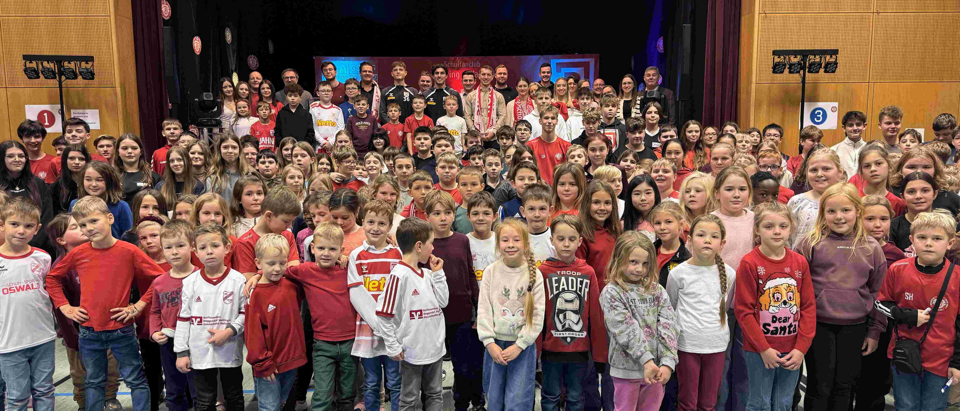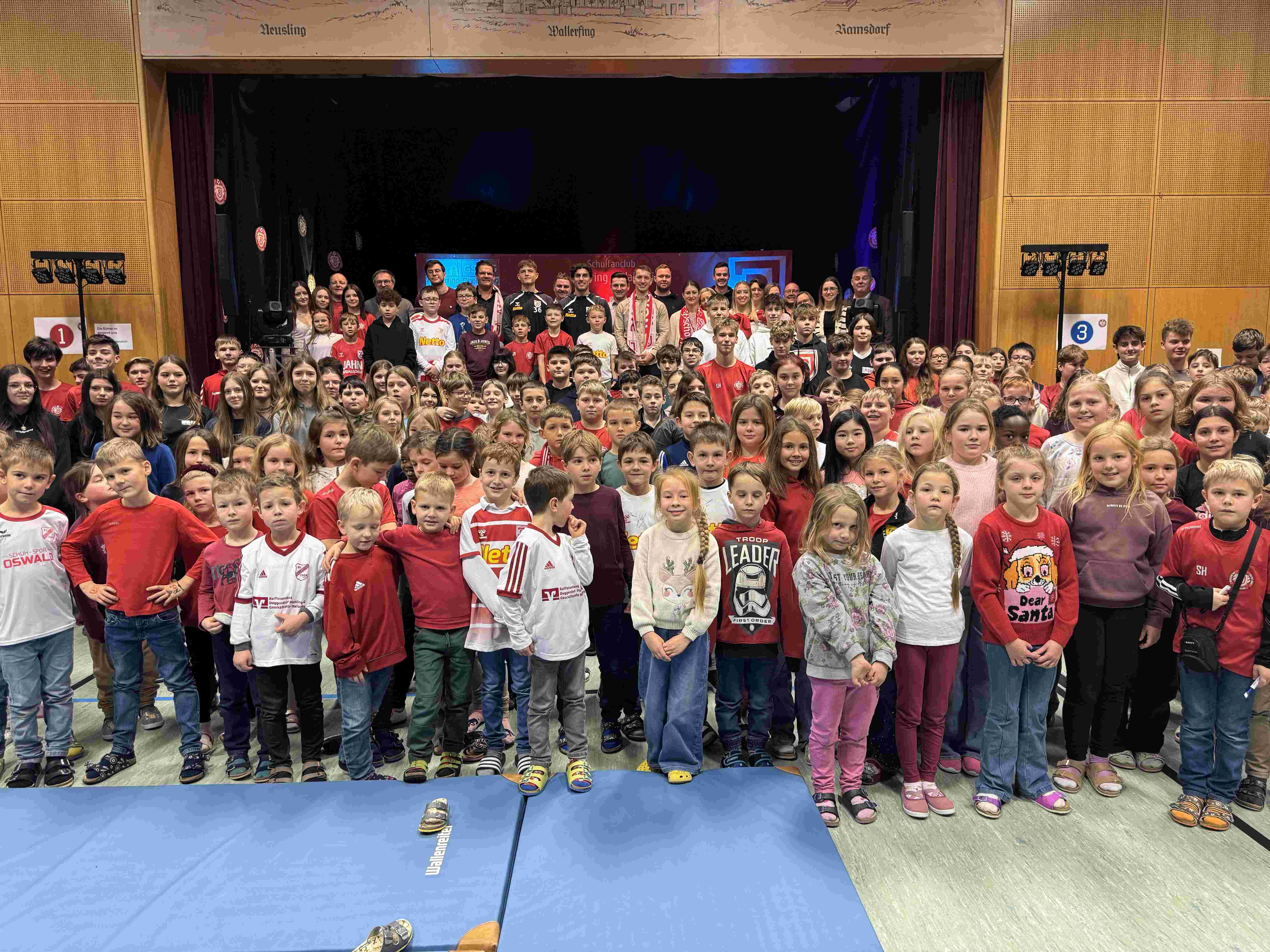Als Benedikt Bauer und Ben Kieffer die Schulturnhalle der Grund- und Mittelschule Wallerfing betraten, warteten fast 200 Kinder mit funkelnden Augen. Denn: Der Schulfanclub “Jahn-Bande” feierte seine erste Weihnachtsfeier und die beiden Profis schauten vorbei. Die Halle war weihnachtlich geschmückt, alles war angerichtet für einen unvergesslichen Vormittag. Neben dem Torwandschießen und einem interaktiven Quiz mit Ben und Bene hatten die Schüler die Möglichkeit, die Profis in einer spannenden Fragerunde besser kennenzulernen. Eine große Autogrammstunde sowie ein Gruppenbild mit allen Anwesenden rundeten den gelungenen Besuch beim Schulfanclub ab.
