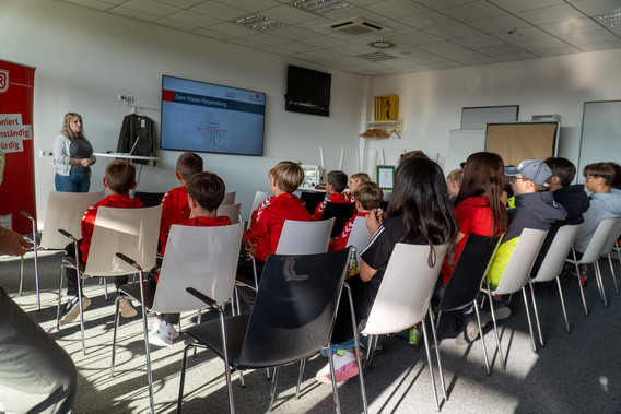 Sabine Obermeier, Projektkoordinatorin für „Zero Waste“ bei der Stadt Regensburg, informierte die Teilnehmerinnen und Teilnehmer in einem Vortrag im Jahnstadion Regensburg über die innovativen Schritte der Stadt zur Reduzierung des Abfallaufkommens. „Es ist uns ein wichtiges Anliegen, die Menschen in Regensburg zu inspirieren und ihnen praktische Wege aufzuzeigen, wie sie ihren persönlichen Beitrag zu einer müllfreien Stadt leisten können“, so Obermeier. „Die gemeinsame Aktion mit dem SSV Jahn bietet eine hervorragende Plattform, um diese Botschaft in die Breite zu tragen und gerade Fußballfans und Bürgerinnen und Bürger zu erreichen.“