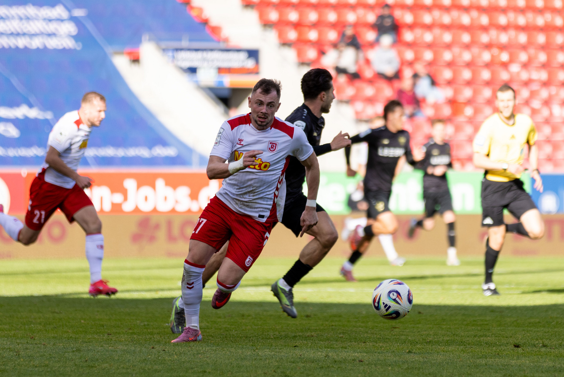 Nach Wiederanpfiff wechselte der SSV Jahn aus: Für Philipp Müller kam Sebastian Stolze neu in die Partie, Bene Saller rückte ins Mittelfeld. Die Jahnelf hatte sich sichtbar in der Pause etwas vorgenommen. Noel Eichinger hatte erst selbst per Kopf die große Chance, ehe er dann drei Gegenspieler stehen ließ und flach in den Rückraum legte. Dort war Erich Hottman eingelaufen und traf zum Anschluss (52.). Wenig später war durchatmen für den Jahn angesagt: Eine Flanke erreichte im Rückraum den starken Majchrzak, seinen Kopfball kratzte Vorlagengeber Eichinger im letzten Moment von der Linie (55.). Als hätte diese Aktion in der Defensive beflügelt, spielte Eichinger aus der eigenen Hälfte einen langen Pass auf Hermes. Der schnelle Angreifer pflückte den Ball mustergültig aus der Luft, wich auf die Seite aus und bediente am langen Pfosten den mitgelaufenen Nicolas Oliveira, der aus vollem Sprint einköpfte - Ausgleich (59.). Doch die Partie ging weiter hin und her. Mansour Ouro-Tagba dribbelte durch den Strafraum und schoss am Tor vorbei (61.). Das Spiel verzögerte sich im Anschluss aufgrund einer kurzen Behandlungspause. Der Torschütze Oliveira wurde am Kopf getroffen, konnte allerdings weitermachen. Die Partie blieb ein offener Schlagabtausch, die Jahnelf drängte auf den Führungstreffer. Auf Großchancen wartete man in dieser Phase von beiden Teams vergeblich. Bis die Schlussviertelstunde anbrach. Erst klärte Leopold Wurm ausgerechnet vor die Füße von Darvich, der den Ball nicht im Jahn Tor unterbringen konnte, dann hatte der SSV Jahn die Doppelchance. Nach einer schnell ausgeführten Ecke waren es erst Fein, dann Mätzler, die es mit wuchtigen Abschlüssen versuchten (87.). Das sollte es aber nicht gewesen sein: In der siebten Minute der Nachspielzeit brachte Eric Hottmann das Jahnstadion Regensburg zum explodieren. Im wegrutschten und mit freundlicher Mithilfe des Innenpfostens kullerte die Kugel zum 3:2 über die Linie (90.+7.). Der SSV Jahn kämpft sich nach einem 0:2-Rückstand zurück und behält die drei Punkte in Regensburg bevor es kommenden Samstag (01.11.) zum FC Erzgebirge Aue geht.