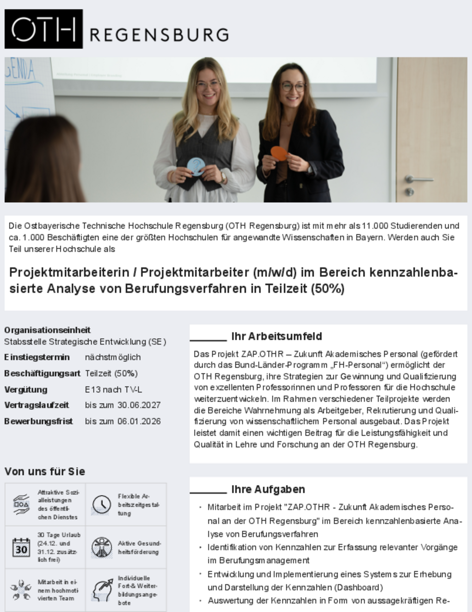 - Mitarbeit im Projekt "ZAP.OTHR - Zukunft Akademisches Personal an der OTH Regensburg" im Bereich kennzahlenbasierte Analyse von Berufungsverfahren