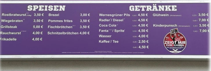 Im Gästeblock kann bar sowie bargeldlos bezahlt werden. Es ist eine Getränke- und Verpflegungsstation vorhanden. Die Mitnahme von Speisen und Getränken ist nicht erlaubt. In unmittelbarer Nähe zum Erzgebirgsstadion gibt es keine Gaststätte. Eine Übersicht der Speisen und Getränke findet sich nebenstehend.
